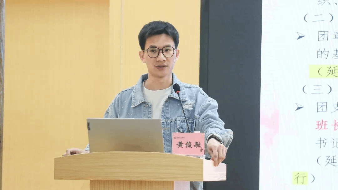 黄俊敏老师以高校团支部建设实务为核心,与全体团支书开展经验交流。他从发展团员、落实“三会两制一课”、开展主题团日活动、团费收缴、组织关系转接等关键团务工作入手,详解工作内容与实施要求,进一步明晰团支书的岗位职责与工作重点。他强调,全体团支书要勤于学习、善于总结,抓实支部思想建设和组织建设,不断提升业务能力,以过硬的专业素养带领班级团支部创先争优、挺膺担当。