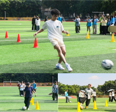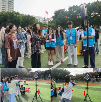 活动当天,全体参赛学生身着轻便运动装,按时到场整队集合,在工作人员的有序组织下完成分组与大合影,定格青春瞬间。随着活动正式启幕,足球绕杆射门挑战、双人筷子夹羽毛球接力、趣味飞镖三大特色项目依次开展,各项目分时段、分场地有序进行,现场设置专属热身区与缓冲区,工作人员全程引导签到、热身,切实保障参赛学生运动安全。