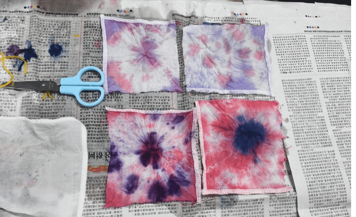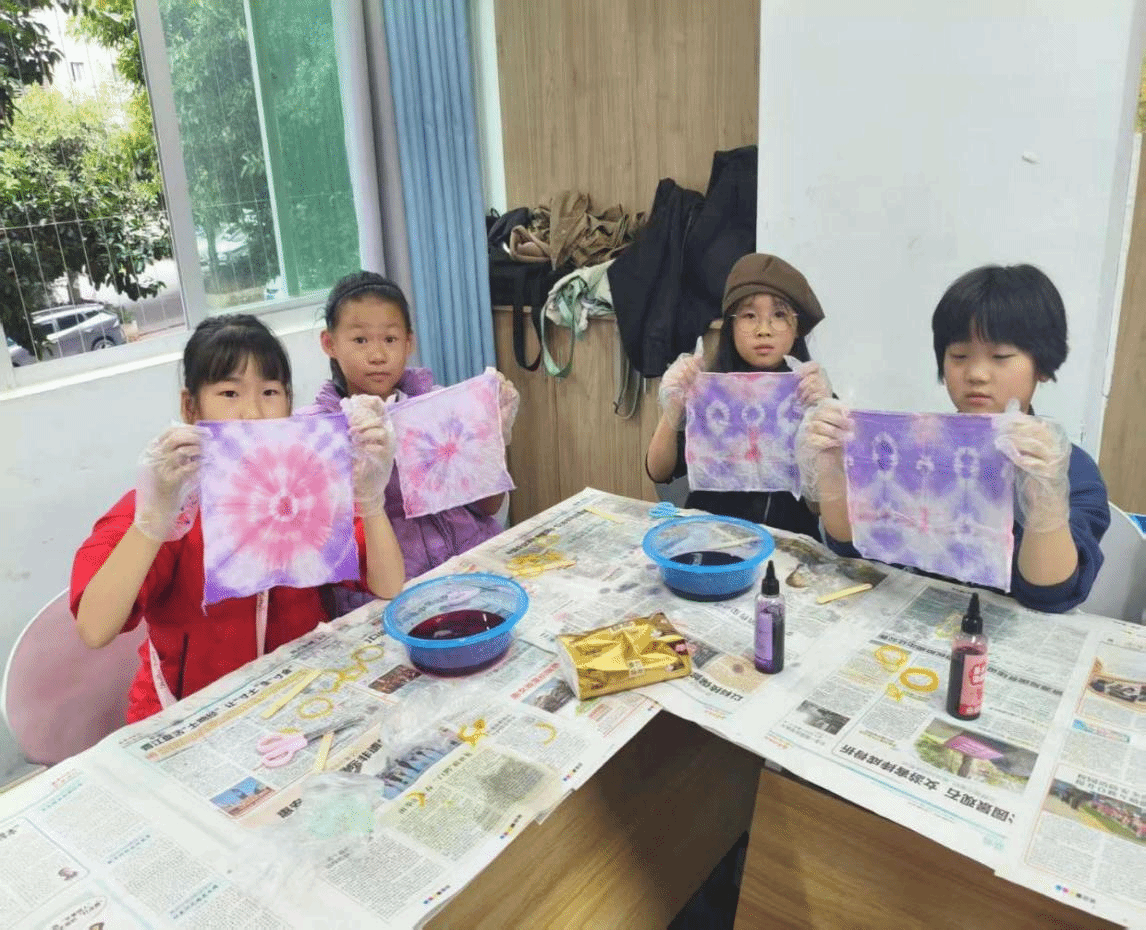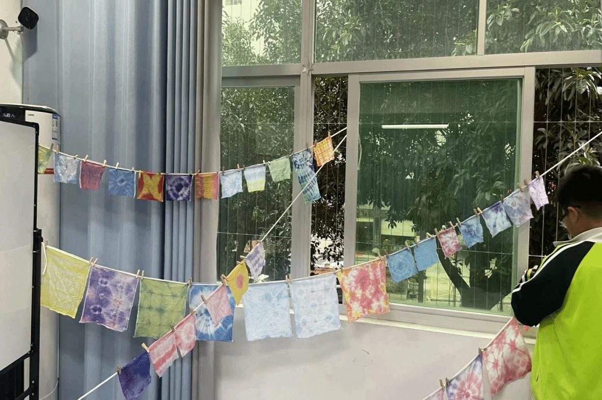 在志愿者指导下,孩子们折叠布料、用皮筋捆扎,再浸入染料,每个人手上的染布都被点上了独一无二的图案,都因各有的差异而独具韵味。最后,共同构成了悬挂在窗边的靓丽风景。