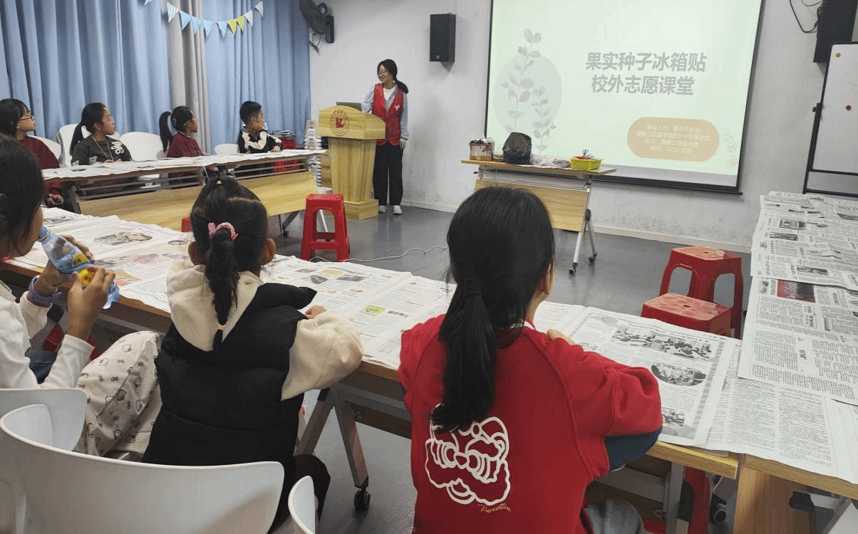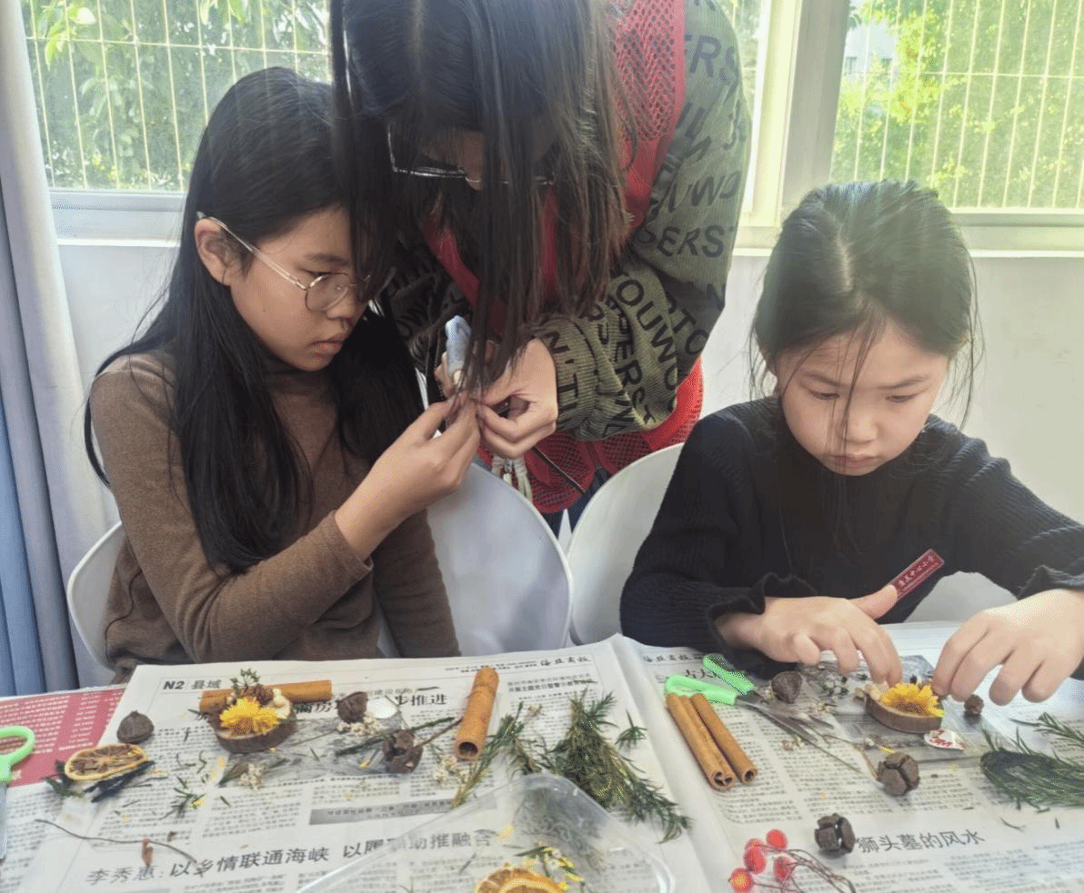 除此之外,我们还进行了果实种子冰箱贴的制作课堂。志愿者在PPT中讲解冰箱贴所需要的制作材料以及制作过程,并悉心进行指导,让小朋友们得以更好发挥创造力,将花种树叶等自然材料拼贴在树桩上,于指尖创造出富有自我创造力的作品。