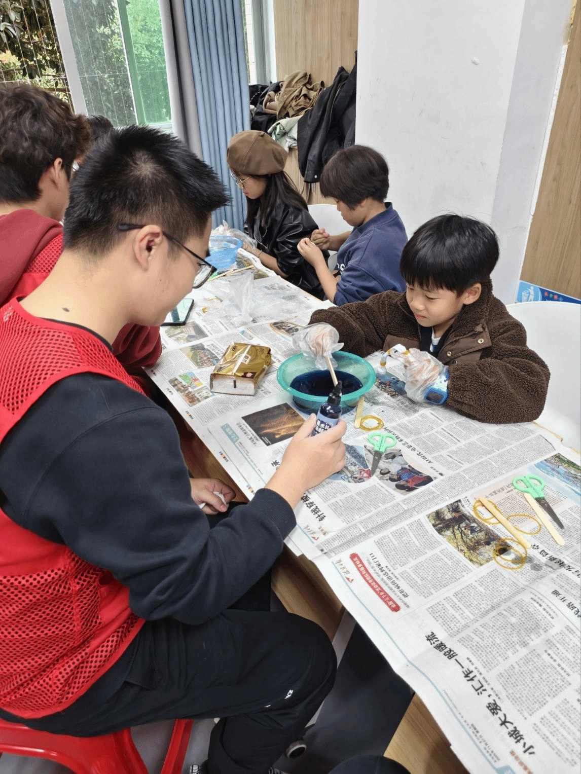 在进行完PPT的讲解教学后,我们便来到了扎染制作阶段,志愿者团队通过分组指导的方式,确保每位参与者都能获得充分的教学支持。