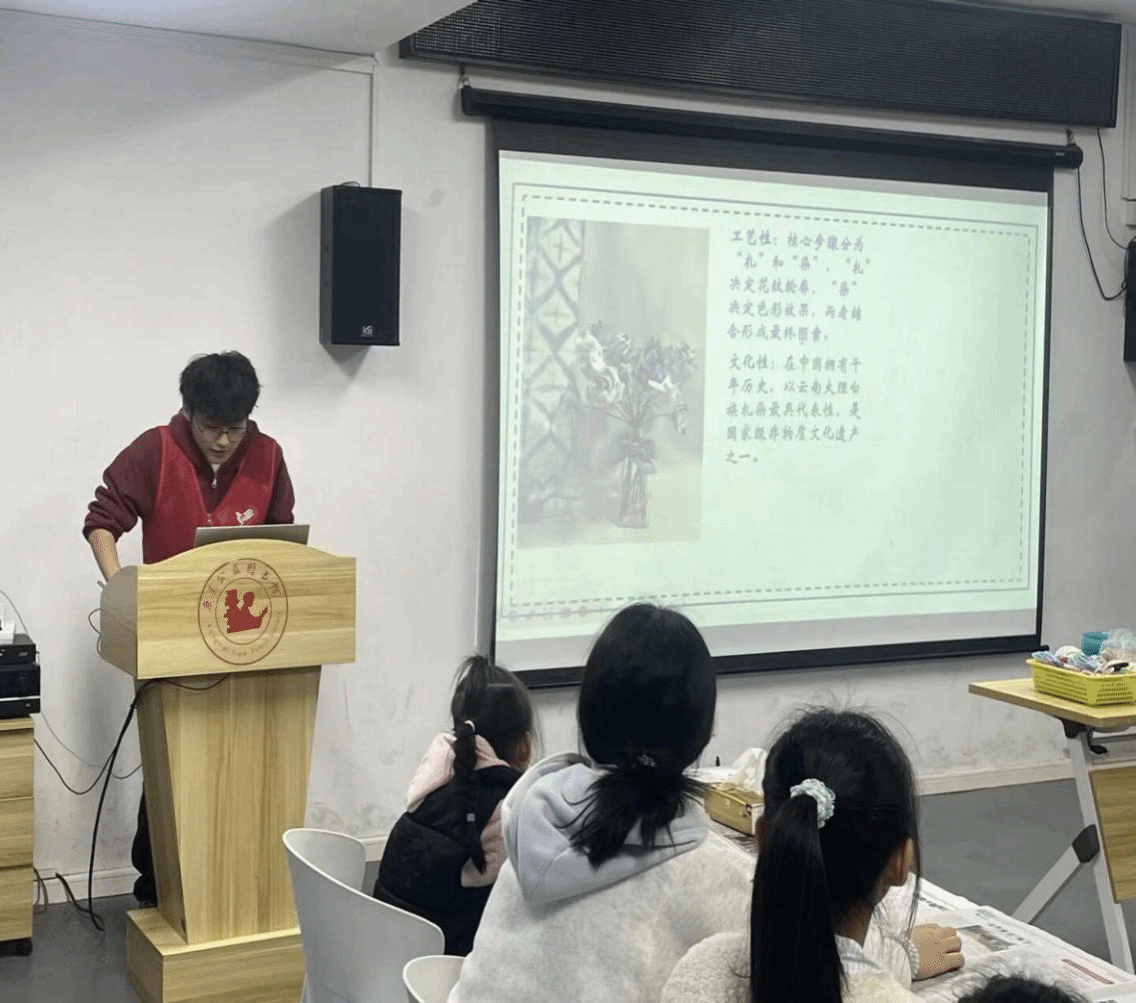 活动进行期间,志愿者们首先用生动的图片与故事,为孩子们揭开了扎染技艺的神秘面纱。扎染源于中国秦汉时期,古称“扎缬”、“绞缬”,是中国历史悠久的民间传统染色技艺。其核心魅力在于,通过线绳的巧妙扎结约束布料,每一幅扎染作品都因其手工扎结的不可复制性而独一无二,被誉为“没有针线的刺绣,不经编织的彩锦”。古人常借此寄托吉祥寓意,使其超越了单纯的工艺,成为承载民族文化与美好祝福的载体。