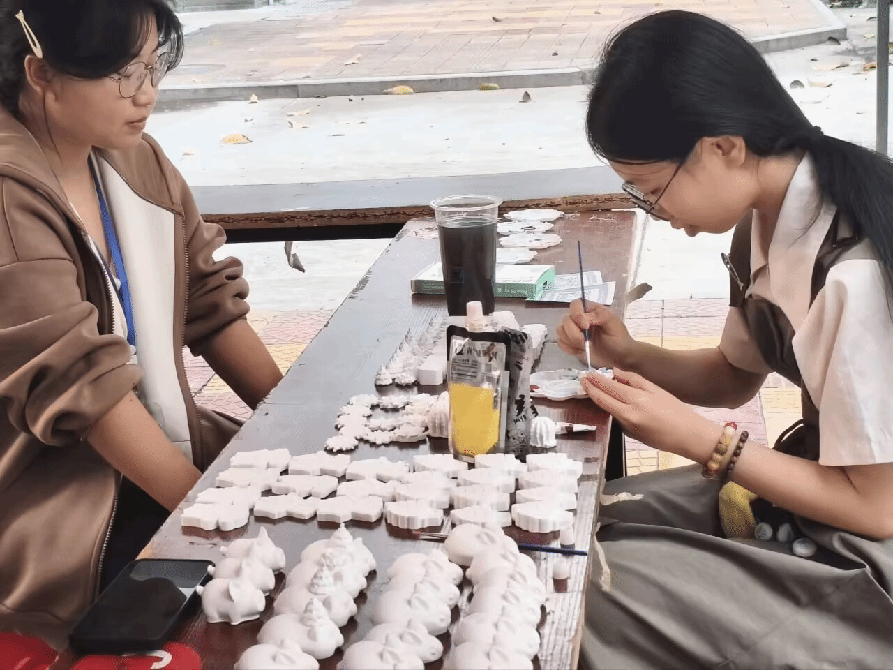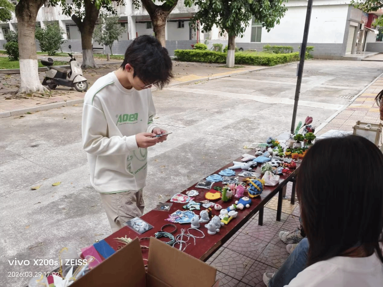 与此同时,活动宣传的到位也吸引了众多老师同学们的参与,大家驻足欣赏、挑选心仪的手作,叫卖与欢笑声交织并行,现场氛围温馨热烈,处处洋溢着青春气息。