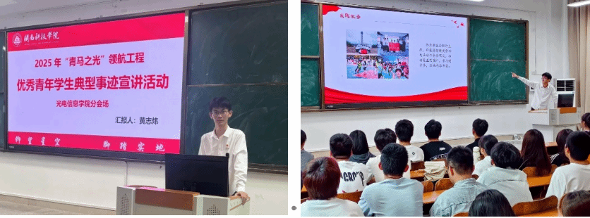 近日,光电信息学院团委举办2025年“青马之光”领航工程优秀青年学生典型事迹宣讲活动,特邀2022级通信工程专业优秀学生黄志炜同学分享其成长故事。他从思想淬炼、学业深耕、实践担当三大维度展开,讲述了自身在专业成绩、奖学金获取、志愿服务及学生工作中的突出表现,以“知行合一”的实际行动践行新时代青年担当。