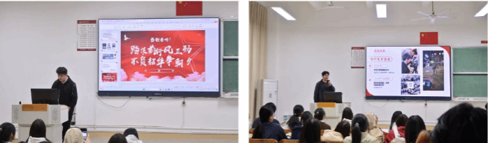 近日,艺术设计学院团委在康美校区菲华楼C101教室开展宣讲会,刘智扬同学、陈磊同学两位优秀学子以“挺膺担当”为核心,从三大维度讲述青春故事。思想上,他们融入“个人理想锚定民族复兴”信念,“请党放心、强国有我”的誓言让学子感受到了青春志向的重量;学习上,结合艺术专业特性,以“每多画一张图,就为国家美育多添一份力”的坚持,展现了“以专业为基,以奋斗为笔”的成长态度;实践中,分享了参与乡村振兴墙绘、社区数字美育的经历,背着画具走乡村、为老人讲绘画技巧的细节,让学子理解“用专业服务社会”的深刻意义。