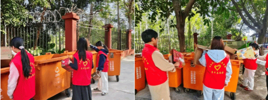 活动现场,志愿者们化身“环保创意官”,分组分工行动,在校园四处广泛收集各种类型废品,将其收集的纸箱、塑料瓶、旧布料等废品改造成收纳盒、台历、挂饰等实用小物。现场设置“创意改造区”与“以物易物角”,同学们既能亲手体验DIY的乐趣,也能交换作品,让废品在交流中焕发新生。志愿者们还向参与同学普及垃圾分类知识,传递绿色生活方式。